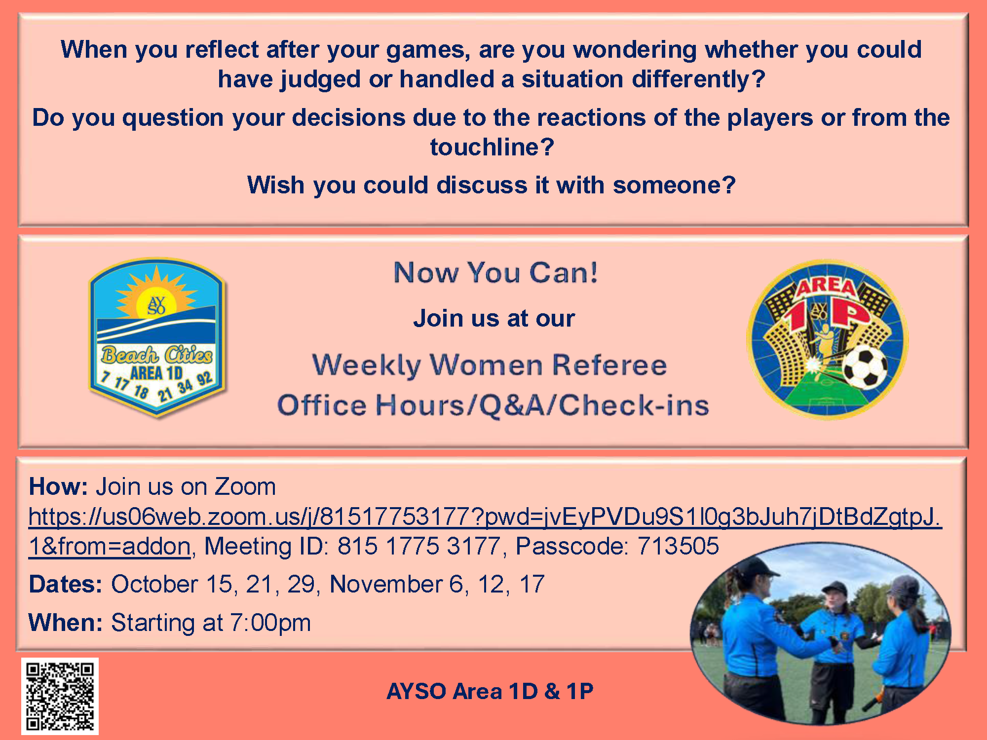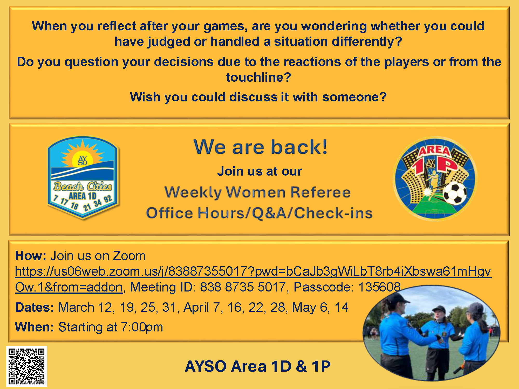 Questions? Contact Petra Wise, Area 1D Director of Women and Youth Referees.